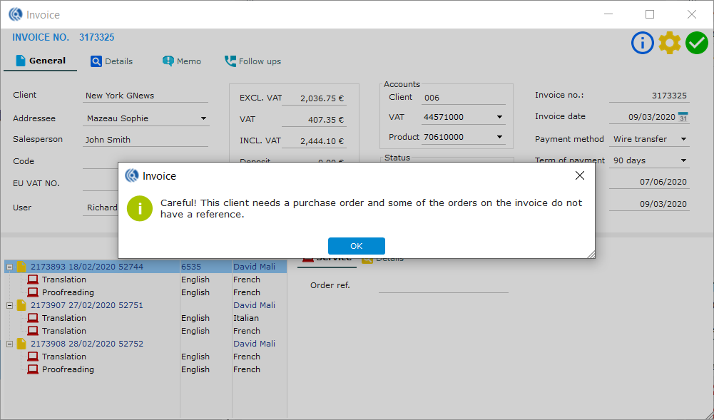 NB: Your invoice is now created with all the information from the client record and orders. If the client requires a PO, and it has not been added yet, a message (see below) will appear until you add one.